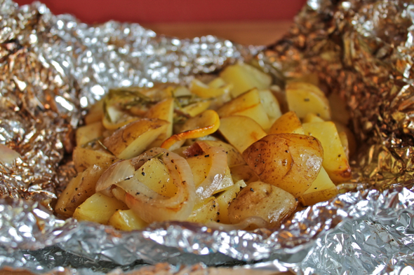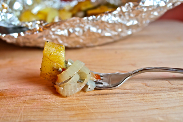 As my summer of grilling rolls along, I am reminded of things that I have eaten over the years, all lovingly prepared on a grill. Untold numbers of grilled vegetables, a foray into beer can chicken, and this, a dish I seem to throw together several times a summer, yet never really bothered to write down, such is its simplicity and limitless propensity for adaptation and transformation. You start with a large piece of foil, add some sort of root vegetable—potatoes, sweet potatoes, carrots, what have you—then throw on some sliced onions or shallots, toss on some cloves of smashed garlic, nestle in some fresh herbs, then dab on a bit of butter or oil (or both), perhaps some lemon slices, maybe something spicy, sprinkle on salt and pepper, then wrap it up, leave it on the grill, and walk away. 30 or 40 minutes later, after doing virtually nothing, you’ve got this: a pouch of steaming, slightly crisp vegetables, caramelized onions and garlic, and a pool of juices meant to be poured over whatever else you’ve got going on your grill. It’s a dead simple dish, and one that I consider a summer standard. I invite you to make it one of yours as well.