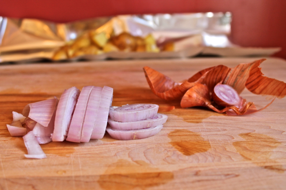 Grill the potatoes, grill lid down, over direct, medium-high heat. Turn once or twice to aid in even cooking (although, to be perfectly honest, I have, on more than one occasion, forgotten to do this and the potatoes turned out just fine). Cook for 30 to 40 minutes, until the potatoes are cooked through and the shallots are meltingly soft and sweet.