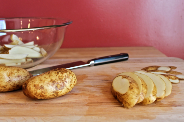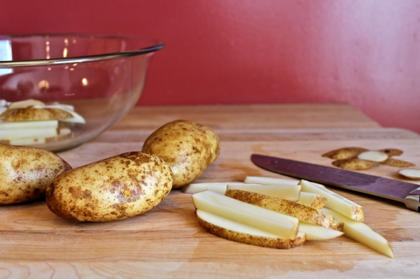 Slice the short ends off of the potatoes, then slice off just a bit of the long sides, creating a somewhat flat surface on either side. Cut the potatoes lengthwise into ¼-inch slices, then cut those long slices into ¼-inch strips.