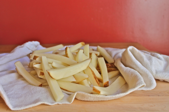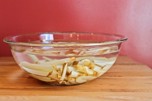 Place the potato strips in a large bowl of lukewarm water, then gently swish the potatoes around until the water becomes quite cloudy. Drain the water from the bowl, refill with lukewarm water once more, then swish the potatoes around again until the water is again cloudy. Drain the water from the bowl, then fill a third time with lukewarm water, and allow the potatoes to sit in the water for at least 30 minutes, or up to 1 hour.
