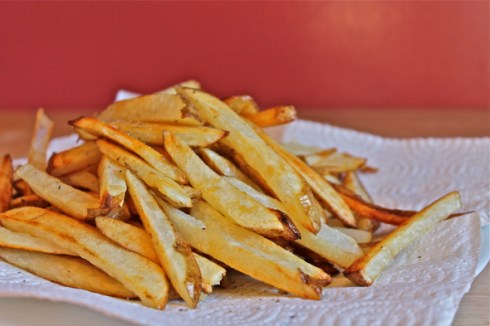 Sara–I have tried this with sweet potato fries, but the results are never the same. I suspect that the trouble lies in the fact that sweet potatoes bake up so much softer than regular potatoes, so it’s much tougher to make them crisp up like a russet potato. However! I have heard that coating sweet potato slices in a bit of arrowroot or cornstarch after soaking them in water will help them bake up into a much crisper oven fry. I have yet to try out this method, but, when I do, I’ll let you know how it goes.
