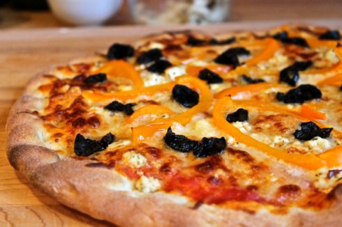 Homemade pizza with orange peppers, salt-cured black olives, and baked ricotta: