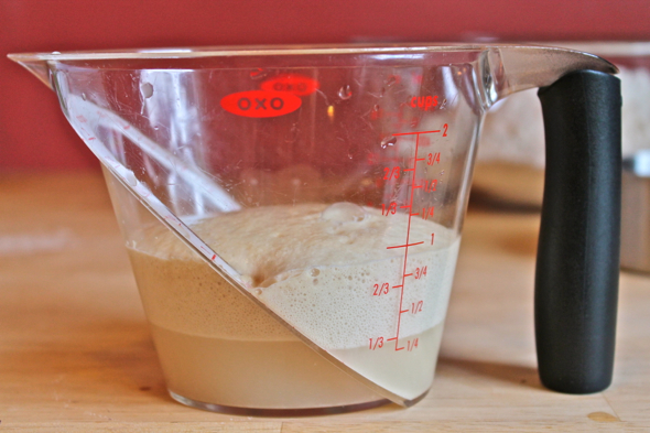In a small bowl or measuring cup, combine the warm water with the yeast and one tablespoon of the honey. Stir to dissolve, then allow to stand at room temperature for 10 minutes, until nice and foamy.