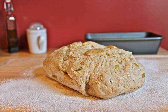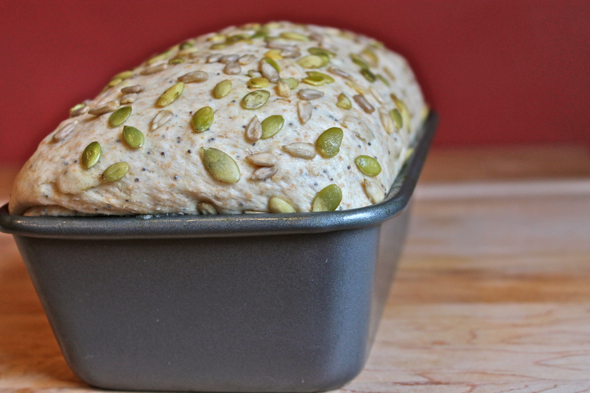 Carefully deflate the dough, then turn out onto a well floured surface. Grease a 9” by 5” loaf pan. Form the dough into a rectangle that is approximately 9” wide and 6” tall. Roll the dough into a tight loaf, pinching the seam closed at the end. Lightly brush or spray the loaf with just a bit of vegetable oil. Sprinkle about 1 tablespoon each of pumpkin seeds and sunflower seeds on your work surface, then roll the greased loaf in the seeds, covering as much of the loaf as possible.
