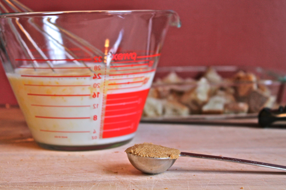 Meanwhile, in a medium bowl or in a large measuring cup, combine milk, eggs, 3 tablespoons dark brown sugar, vanilla, and salt. Whisk vigorously until the brown sugar has dissolved and the eggs are completely combined. Place the bread cubes in an 8” x 8” square baking pan, then pour the custard over the bread, soaking every piece as much as possible. Allow bread to rest in the custard for 15 minutes, pushing the bread down into the custard every couple of minutes to ensure that everything gets nice and soaked.
