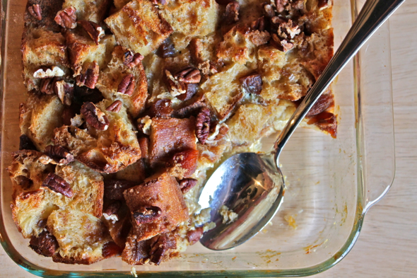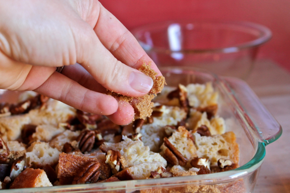 When the bread has finished soaking, remove the apricots from the bourbon (discarding the remaining bourbon, ahem, in any way you wish). Add the apricots to the soaked bread, using your fingers to poke the fruit down and really nestle them in. Sprinkle the pecans over the top of the bread, then sprinkle over the 1 teaspoon of dark brown sugar.