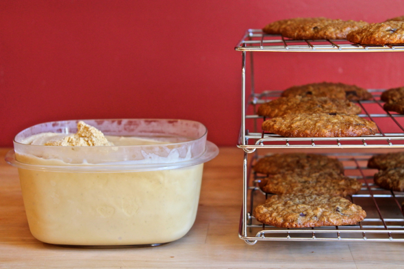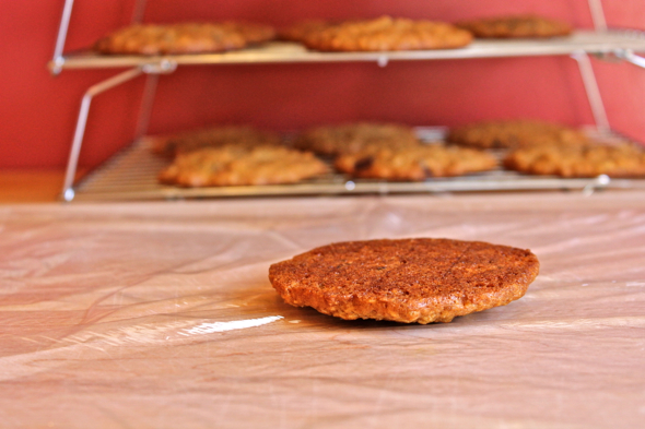 Bake a sheet of cookies for 10 to 12 minutes, until golden at the edges, rotating the sheets halfway through baking (Lebovitz’s book dictates that you bake the cookies for twice as long as this, for reasons unknown. I followed his instructions at first, but the cookies came out burned and hard as rocks). Remove cookies to a wire rack to cool completely. Finish baking all cookies in this manner. You should end up with 16 large cookies.