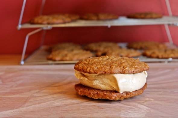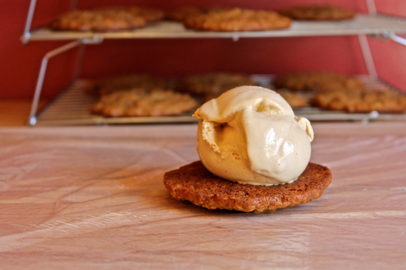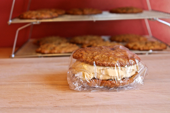To assemble ice cream sandwiches, top one cookie with a generous scoop of ice cream, then top the ice cream with another cookie. Press down slightly to help the ice cream fill out the circumference of the cookie. Freeze ice cream sandwiches, wrapped in plastic wrap, if you wish, until firm enough to not splat out everywhere when you bite down on them, at least a few hours.