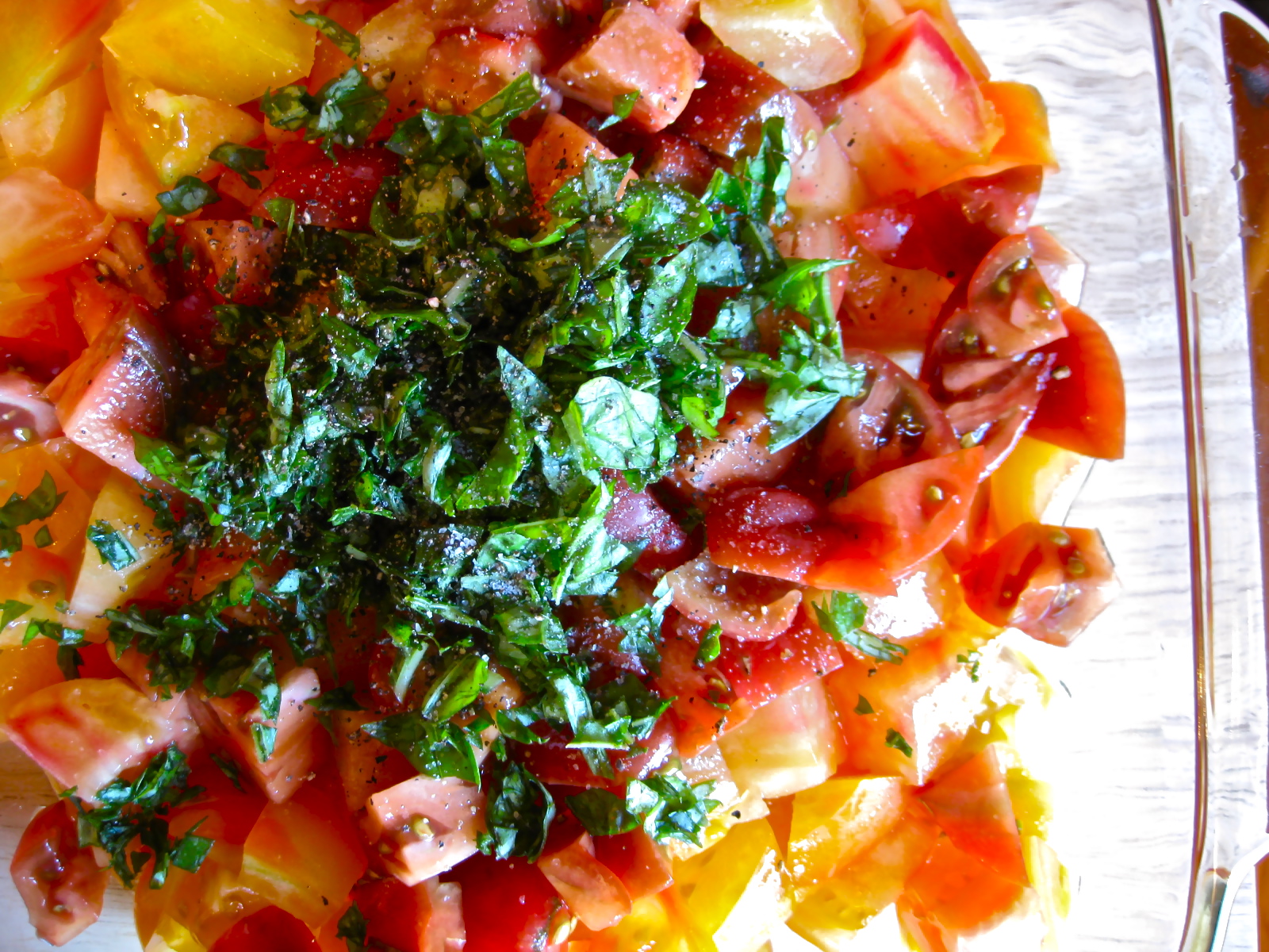 Place chopped tomatoes and basil in an 8-inch square glass baking dish. Add salt and pepper to taste, then toss gently to combine.