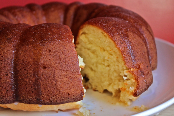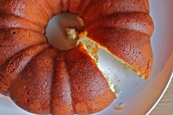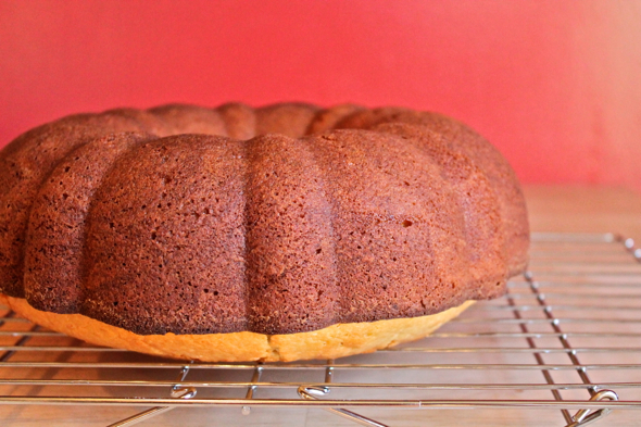 My first attempt at this cake found me trying to bake the entire thing in a too-small fluted cake pan, a cute little number that is only 6 inches wide, but exceptionally deep, making for a cake that was beautifully browned along the edges, but unfortunately underdone in the very center. My next attempt included the use of the same pan, only with a slightly altered recipe that changed the egg ratio, the amount of cornstarch, and the baking time. The cake cooked all the way through this time, but about two minutes after I took it out of the oven it completely collapsed, folding in on itself like a deflated wading pool.