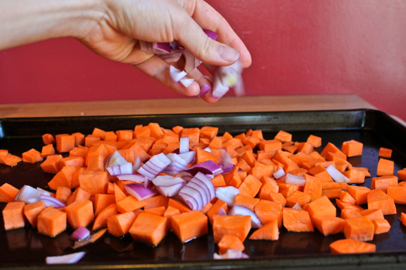 Preheat oven to 450 degrees Fahrenheit. On a large baking sheet, toss together the sweet potato chunks, diced red onion, and olive oil. Roast in the center of the oven until the sweet potato is tender and browned in spots, about 20 minutes. Transfer to a large bowl and allow to cool completely.