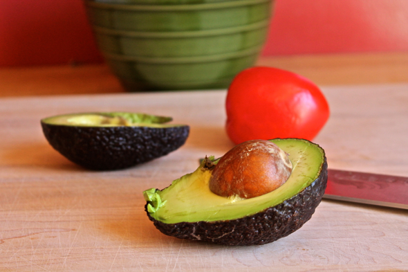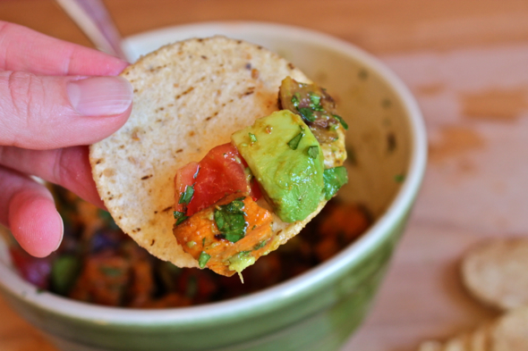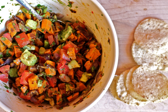 A salsa like this, hearty with savory roasted sweet potatoes and onions, can be moved in several directions. With chunks of fresh avocado and tomato, it certainly works as an appetizer to be scooped up by tortilla chip, but, piled on top of a bed of greens, it would also make a great salad. You can fold in some black beans and take it to a potluck as a summer salad to share. You can slather it on lightly toasted bread and top it with some arugula and a squeeze of lemon or lime juice. Of course, you can also eat it as is, with no tortilla chips, which is what I initially did after mixing it together, taking a taste, then discovering that I was finding it difficult to stop tasting.
