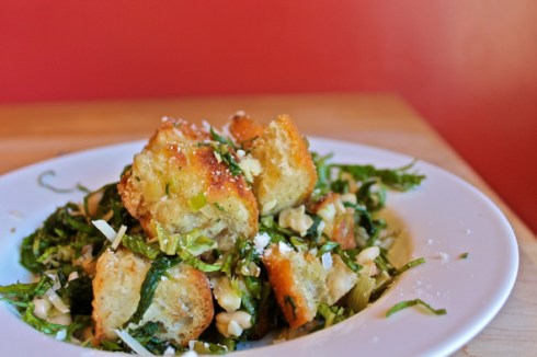 In a large skillet set over medium-low heat, heat 1 tablespoon of olive oil. When oil is just beginning to shimmer, add bread cubes in a single layer and allow to crisp on one side (this should take anywhere from 2 to 4 minutes). Turn bread cubes over, then allow to crisp some more, shaking the skillet ever now and again to keep the bread moving around in the oil just a tad. Remove bread cubes and set aside.
