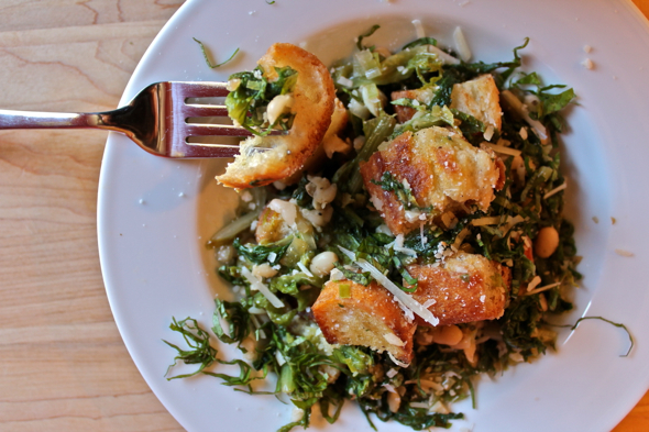 This is the type of food that could be considered a kid-repellent. It boasts a combination of punchy bitter greens, smooth leeks, and the kick of red pepper flakes. However, it also contains white beans, crisp, sautéed bread, and parmesan cheese, three things for which, in my experience, children tend to go completely nuts. As you might sense, these discrepancies combine to make one very interesting conundrum.