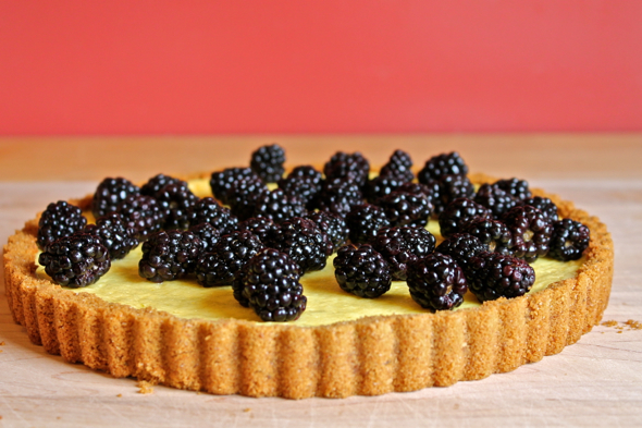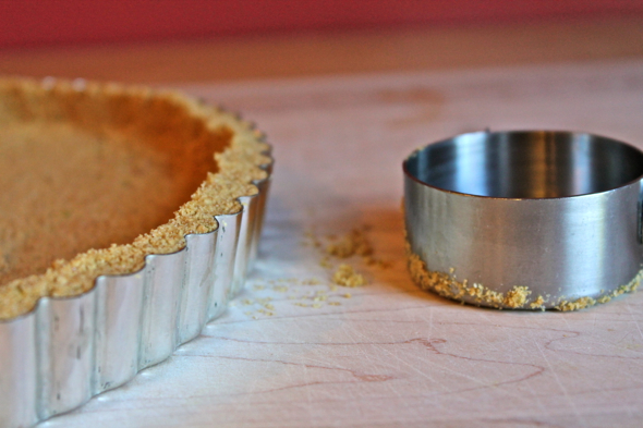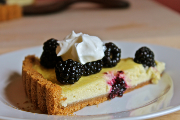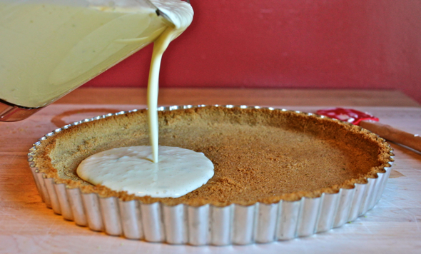 Pour enough cake batter into the prepared springform pan to just cover the bottom. Release the cooled pie from its pan (I ran a very small and flexible spatula around the inside perimeter of the pie pan before turning the pie out onto my open palm), then place the pie, right-side up, on the thin later of cake batter in the springform pan. Very lightly press the pie into the batter, just to secure it in place. Pour the rest of the cake batter over and around the pie, covering as much territory as evenly as possible. Smooth the top of the cake batter.