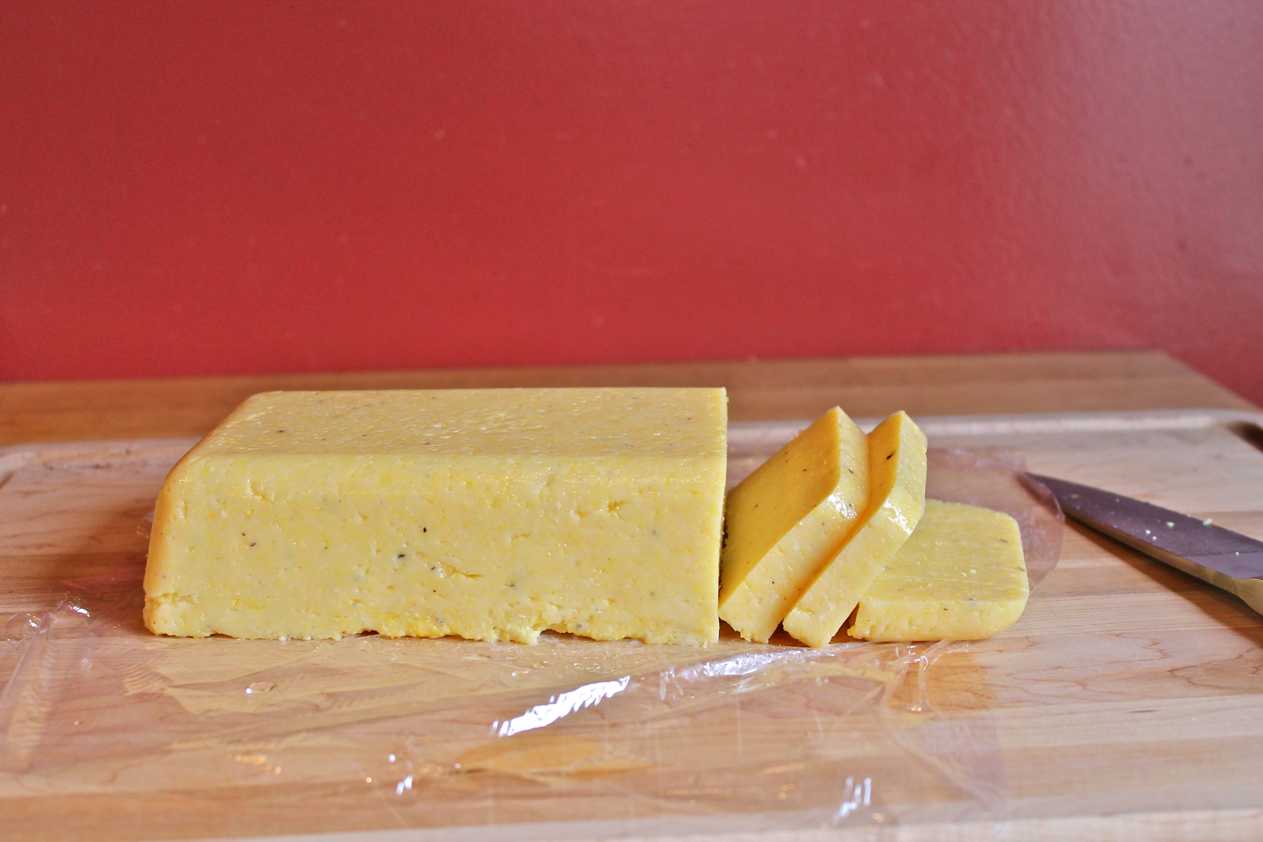 When the polenta is completely cool, gently run a thin spatula or knife around the edges of the loaf to separate it from the pan, then invert the polenta loaf onto a cutting board. If the polenta remains firmly stuck in the pan, submerge the bottom ¾ of the pan in a pool of warm water, and allow the pan to heat up a bit and help loosen the polenta.