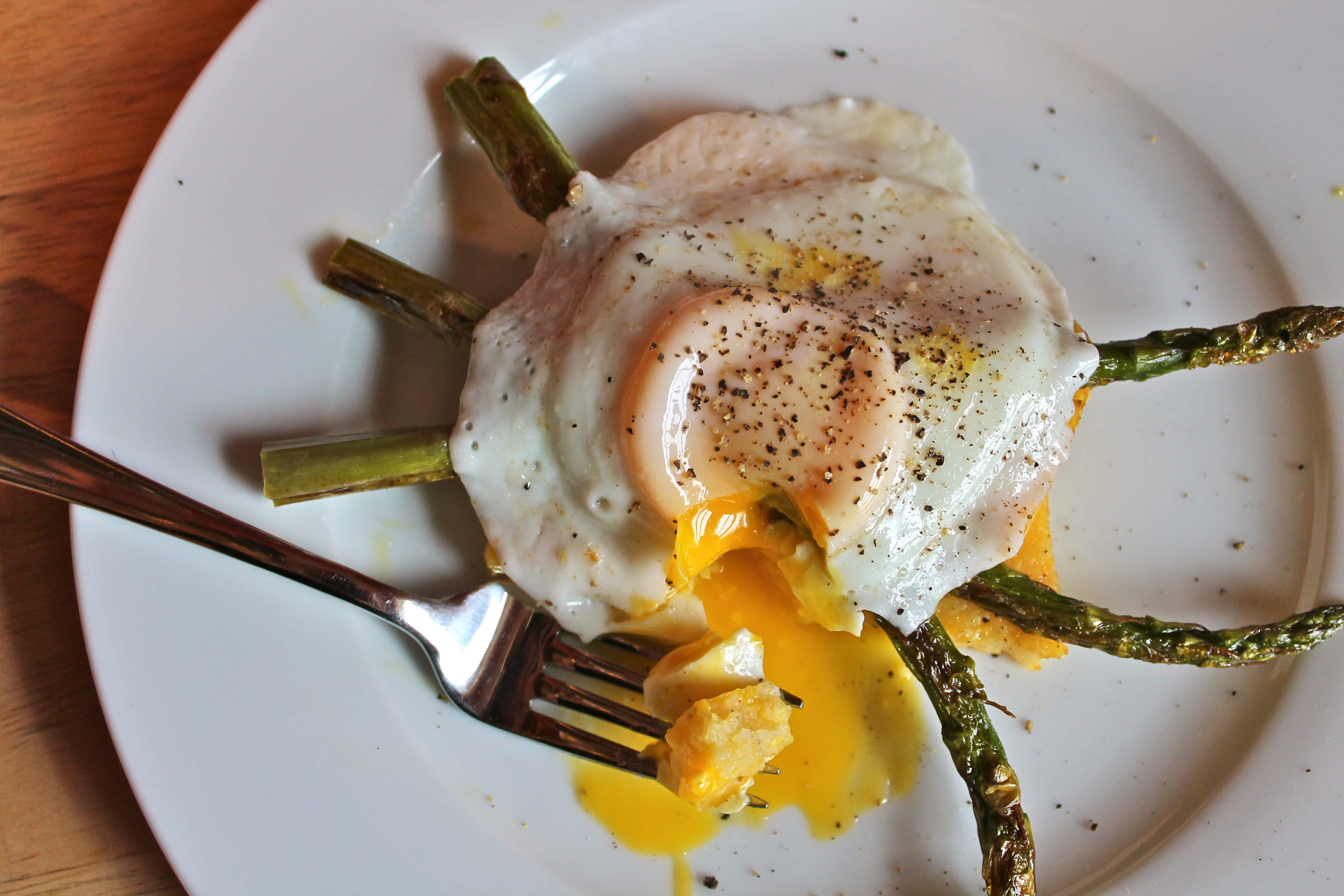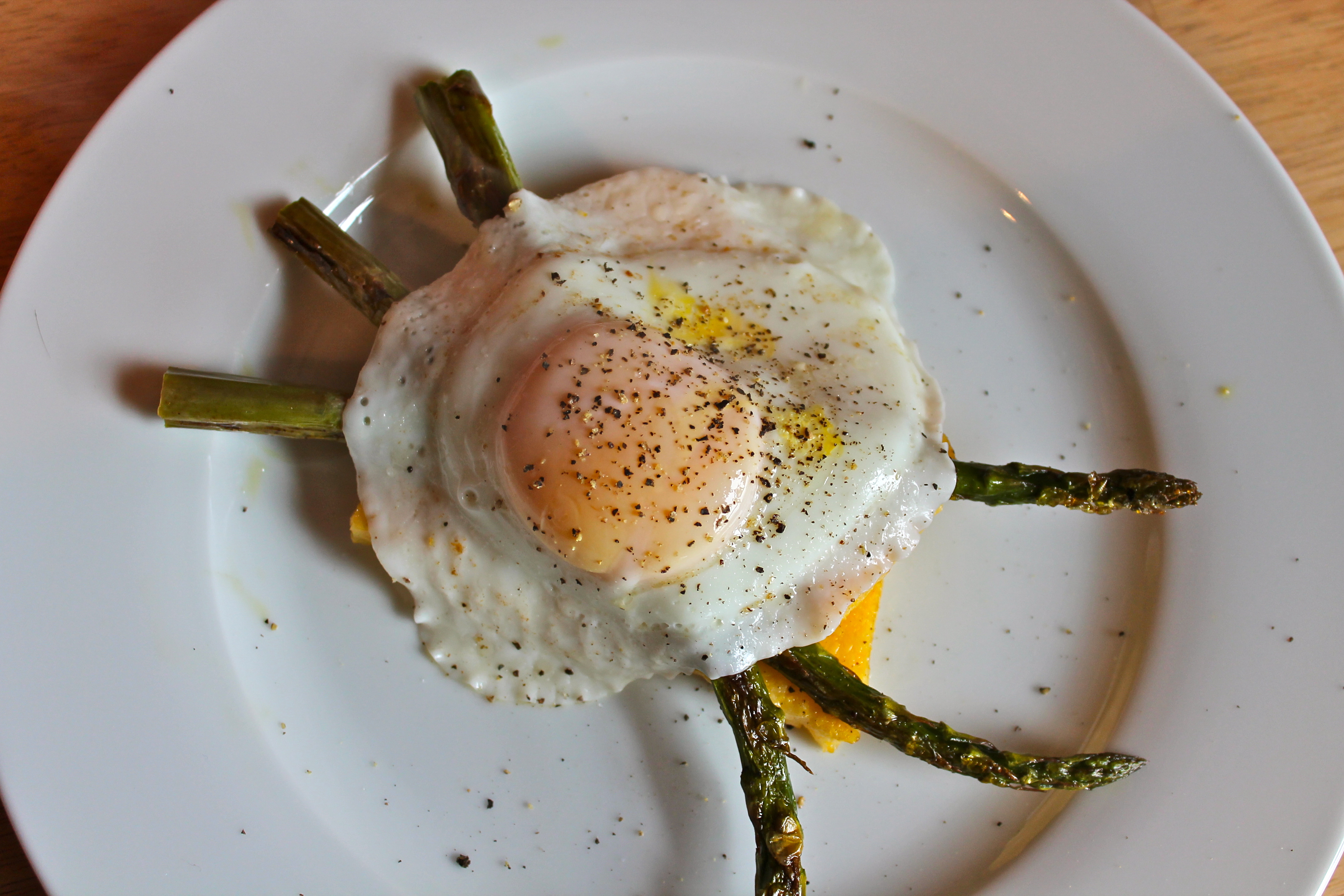 Place asparagus spears over slices of sauteed polenta toast, then top asparagus with a fried egg. Add more salt and pepper to taste.