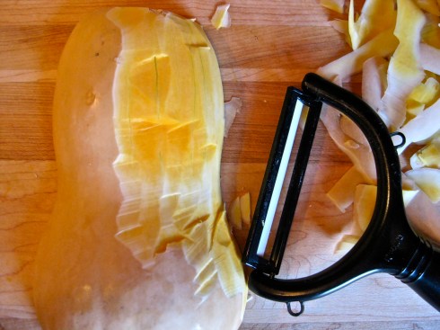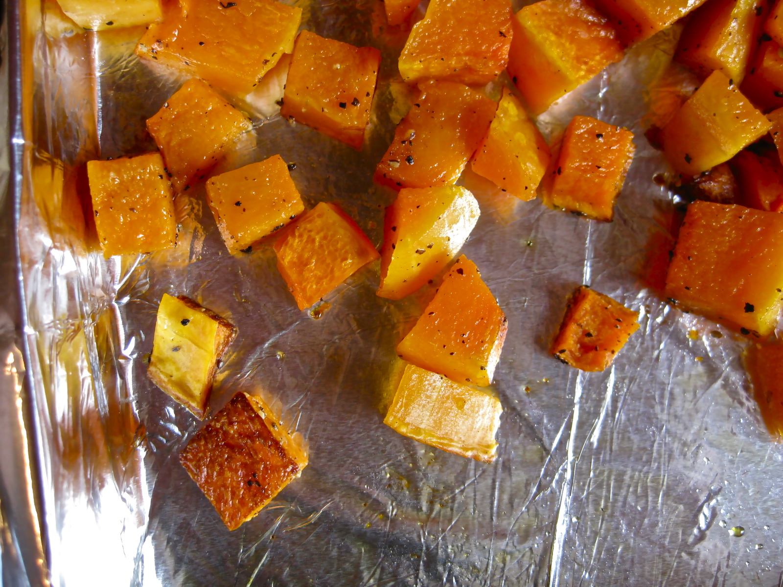 Using a sturdy vegetable peeler or shaver, remove the peel from the squash, then cut it in half and remove the seeds. Slice the squash into ½-inch chunks. Place squash chunks on a heavy baking sheet, add the olive oil and salt and pepper to taste, then toss to combine. Roast the squash until it is soft but not falling apart, and the bottoms have just begun to caramelize, about 20-25 minutes. Remove squash from oven and allow to cool slightly while you prepare the other ingredients.