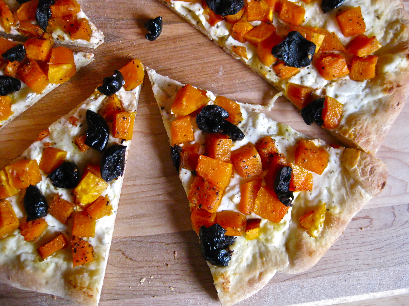 Butternut Squash and Dry-Cured Olive Pizza with Ricotta and Chevre