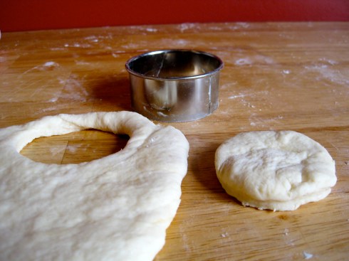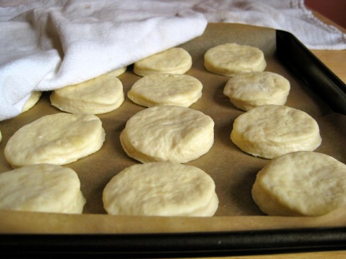 Form the risen dough into a ball and turn out onto a generously floured surface.  Knead lightly and quickly, about 1 minute.  Roll out with a lightly flour rolling pin to about 1/2 inch thick.  Cut with a floured 2 1/2 round cutter and place barely touching on the prepared sheets.  Cover with a kitchen towel and set aside to rise just until puffy, 20 to 30 minutes.