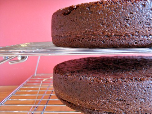 Allow the cakes to cool in their pans for 10 to 15 minutes, then run a small knife around the edges of the cakes and flip them out onto a wire rack to finish cooling completely. Peel off the parchment paper and allow cakes to cool for at least 2 hours.