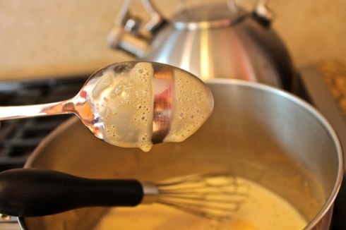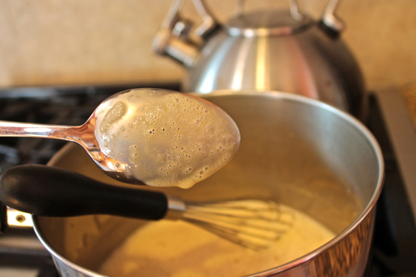 Whisk the milk and salt into the caramel mixture. Lightly whisk together the egg yolks in a bowl, and very slowly add the caramel cream, whisking constantly as you pour in the hot liquid. Return the mixture to the saucepan in which you cooked the caramel, and gently heat the custard mixture over low heat until it reaches around 165 to 170 degrees Fahrenheit. The mixture should easily coat the back of a spoon.