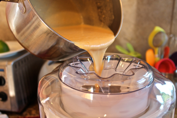 When both mixtures have cooled, combine them in a blender or food processor and blend on high speed until completely smooth and combined. Stir in lime juice and vanilla, then refrigerate until complete cooled, about 2 hours. Alternately, if you don’t want to wait, you can place the nectarine custard mixture in a thin, nonreactive metal bowl, place the metal bowl in larger bowl filled with mostly ice with a bit of water, and stir the mixture as the metal bowl rests in its ice bath. After about 10-15 minutes of careful stirring (being careful not to tip the custard bowl over into the ice water), the mixture will become quite cold.