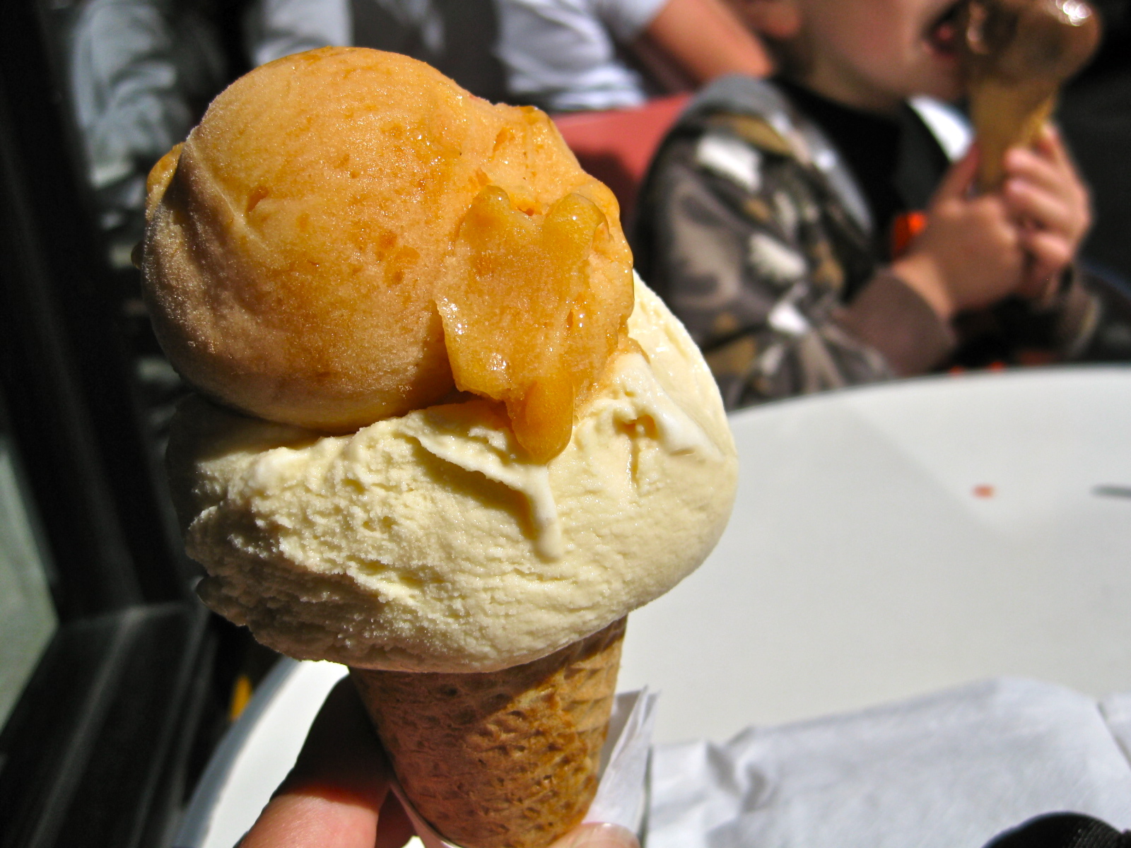Twenty minutes later, the ice cream churning into a thick and luscious concoction, I snuck another taste. Still not gingery enough. I grated some fresh ginger and added it to the whirring machine. Two minutes later, I tasted it again. I added more ginger. I tasted it again. I added more ginger. By this point, realizing that I was nearly out of ginger, I opened up a cupboard and prepared to let loose once more with the bottle of ginger extract.