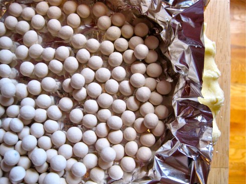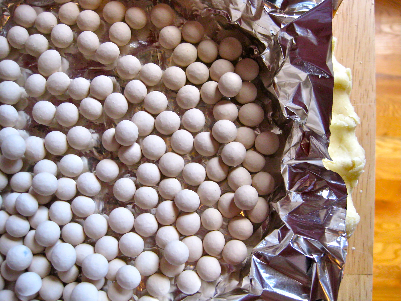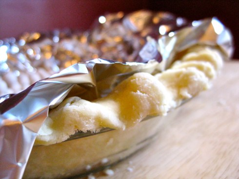 Place the circle of dough in a 9-inch pie plate, lightly pressing the dough against the sides of the plate. Trim any overhanging edges of the dough, then crimp the outer edges. Cover the dough with a piece of aluminum foil, and fill the foil with pie weights or a large handful of pennies. Bake the pie crust for 20 minutes, then remove the foil and weights and continue to bake for another 10 minutes, until the edges of the crust have turned golden brown. Set aside to cool.