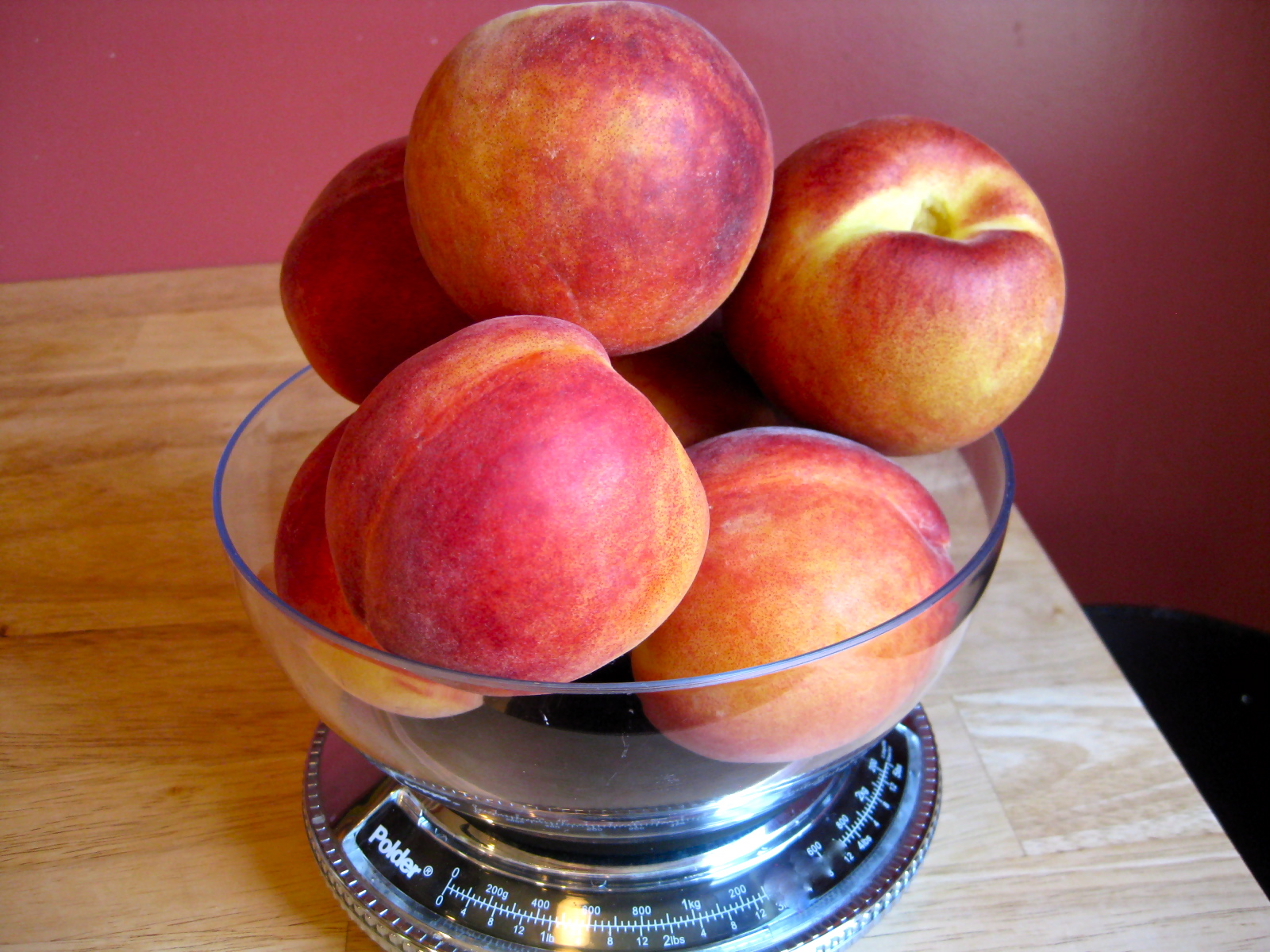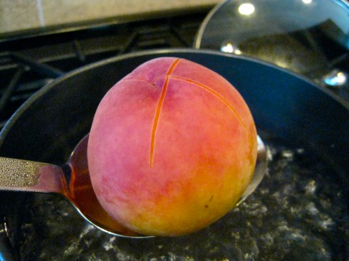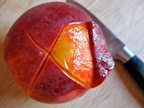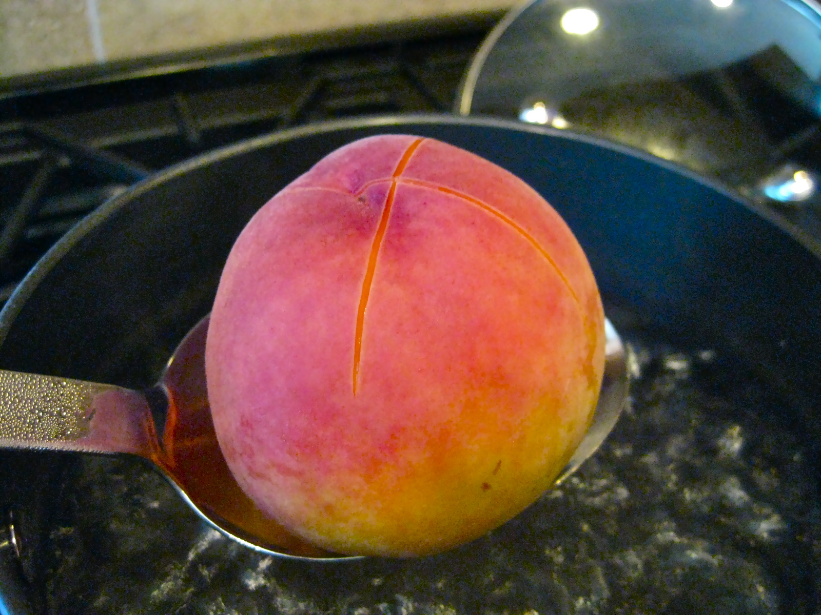 To peel peaches, cut a small x in the bottom of each peach, then blanch in boiling water for 15-20 seconds. Immediately remove each peach and plunge into ice water to prevent it from cooking. Drain the peaches. After all the peaches have been blanched, use a knife to cut each peach in half from top to bottom, then carefully separate each peach into 2 halves and remove pit.