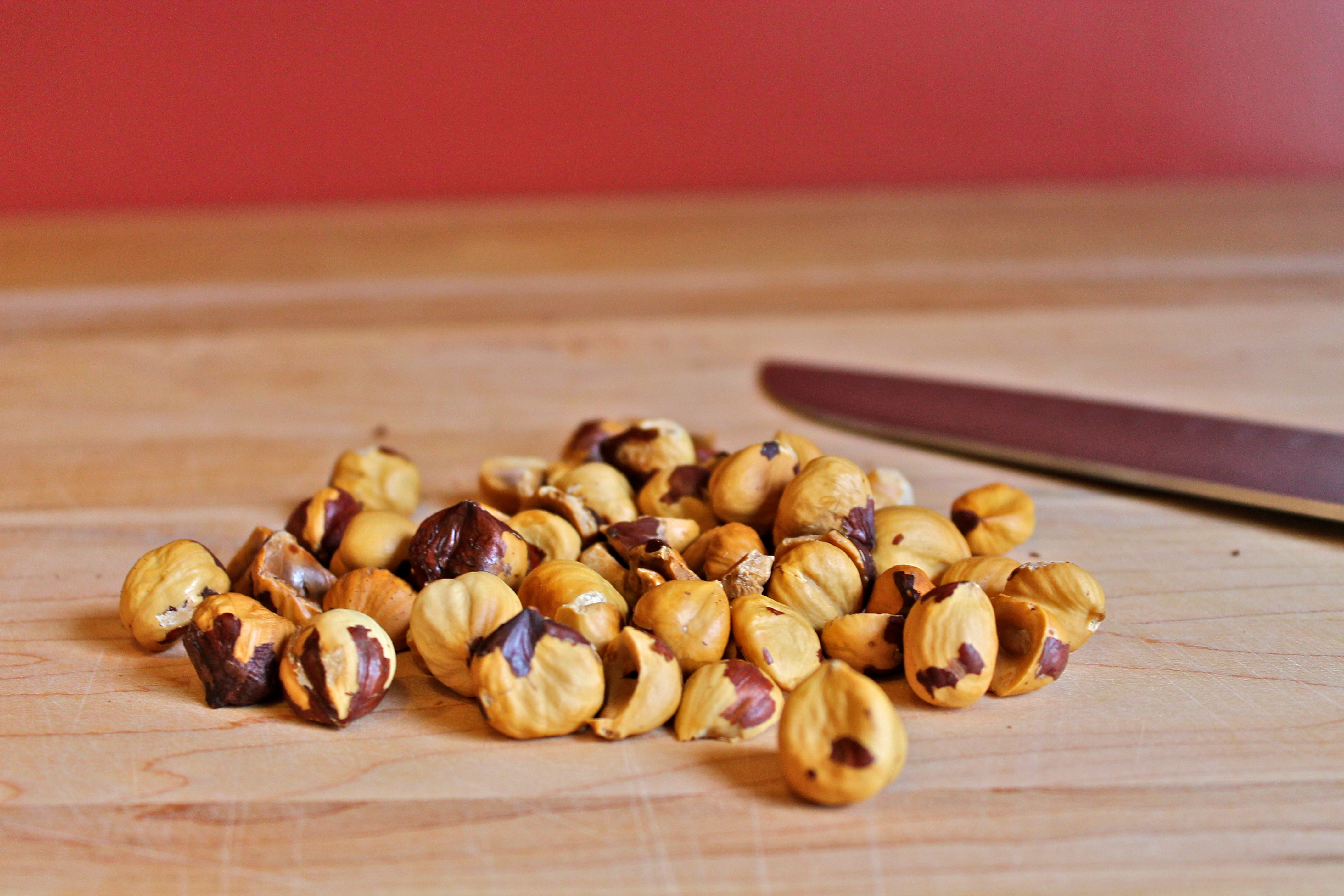 Preheat oven to 350 degrees Fahrenheit. Arrange hazelnuts on a baking sheet, then toast in oven for 10 to 15 minutes, until the skins of the nuts begin to peel loose and the nuts appear dark golden brown. Remove the nuts to a clean dishtowel, then wrap the towel around the nuts and allow to sit for a couple of minutes. Then, with your hands, vigorously rub the hazelnuts in the dishtowel to remove the hazelnut skins. Coarsely chop the de-skinned nuts (cutting them in half is just fine—you want nice big bites here), then set aside.