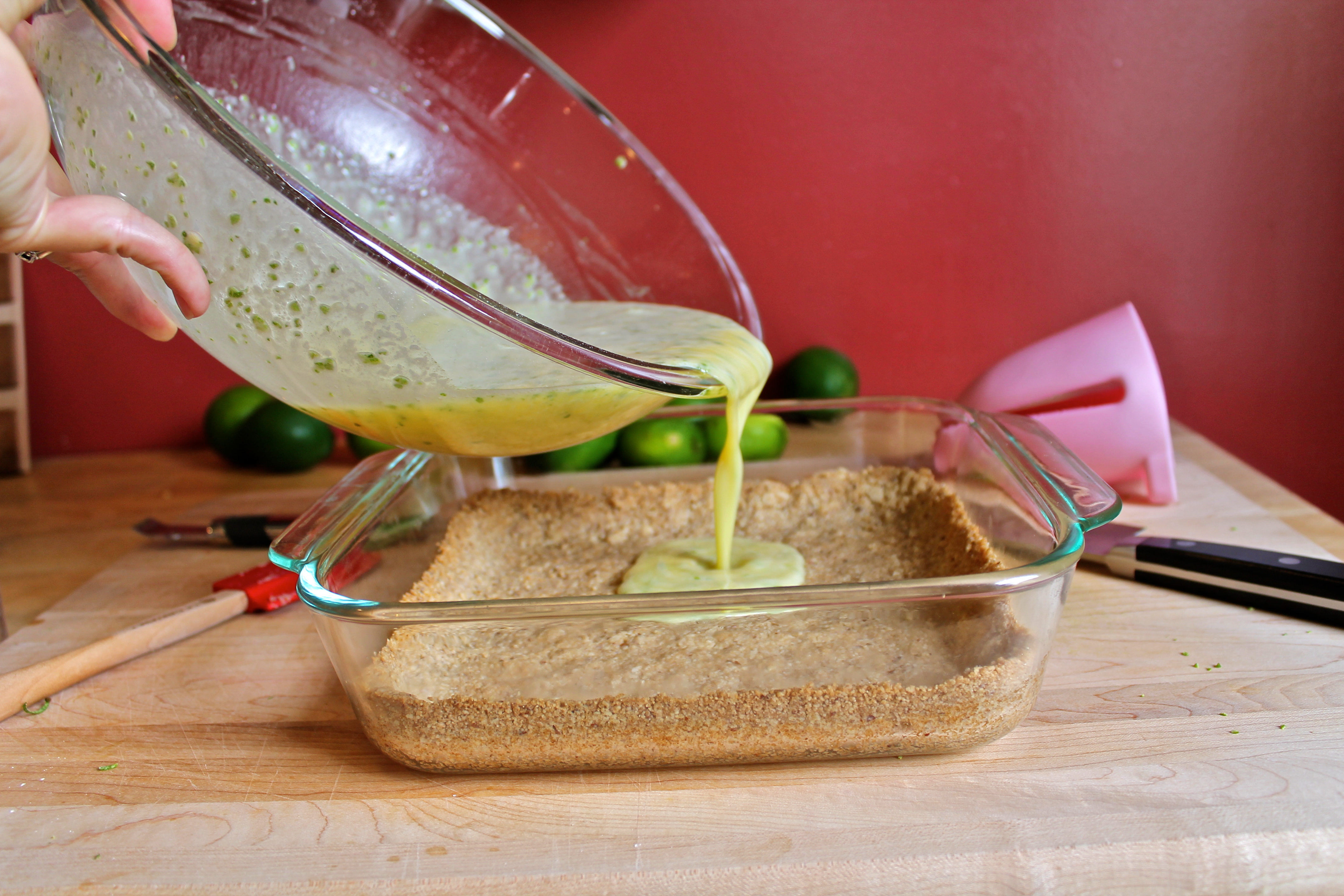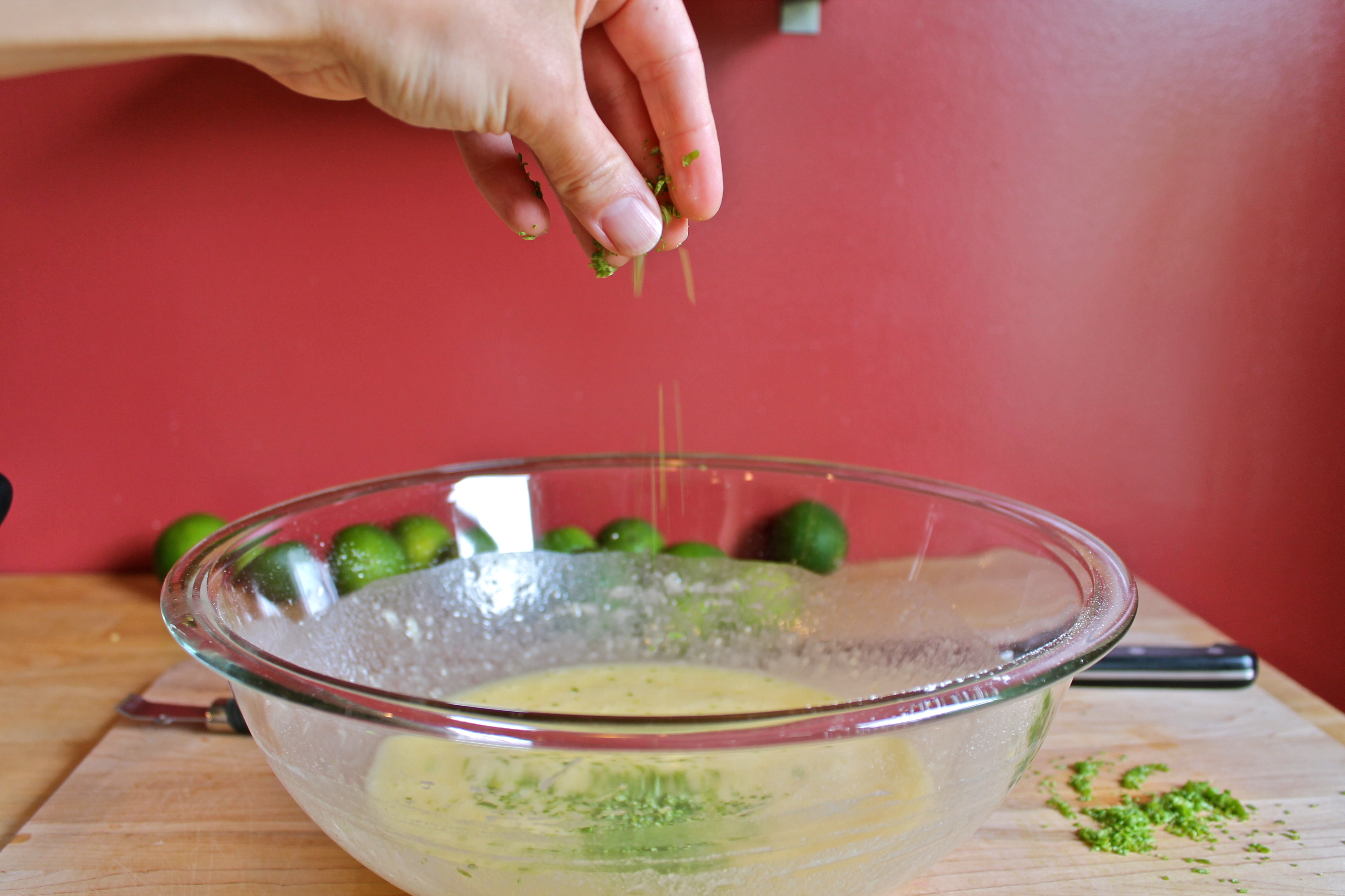 While the crust is baking, prepare the filling by whisking together the eggs, egg yolk, and sugar. Whisk in the flour, lime juice, lime zest, and salt. As soon as the crust is done baking, remove it from the oven, pour in the lime mixture, and return the pan to the oven. Bake for 17 to 20 minutes, until the center is no longer wobbly and the top of the bars are only slightly firm to the touch (a finger touched in the center of the bars should leave only a slight indentation.