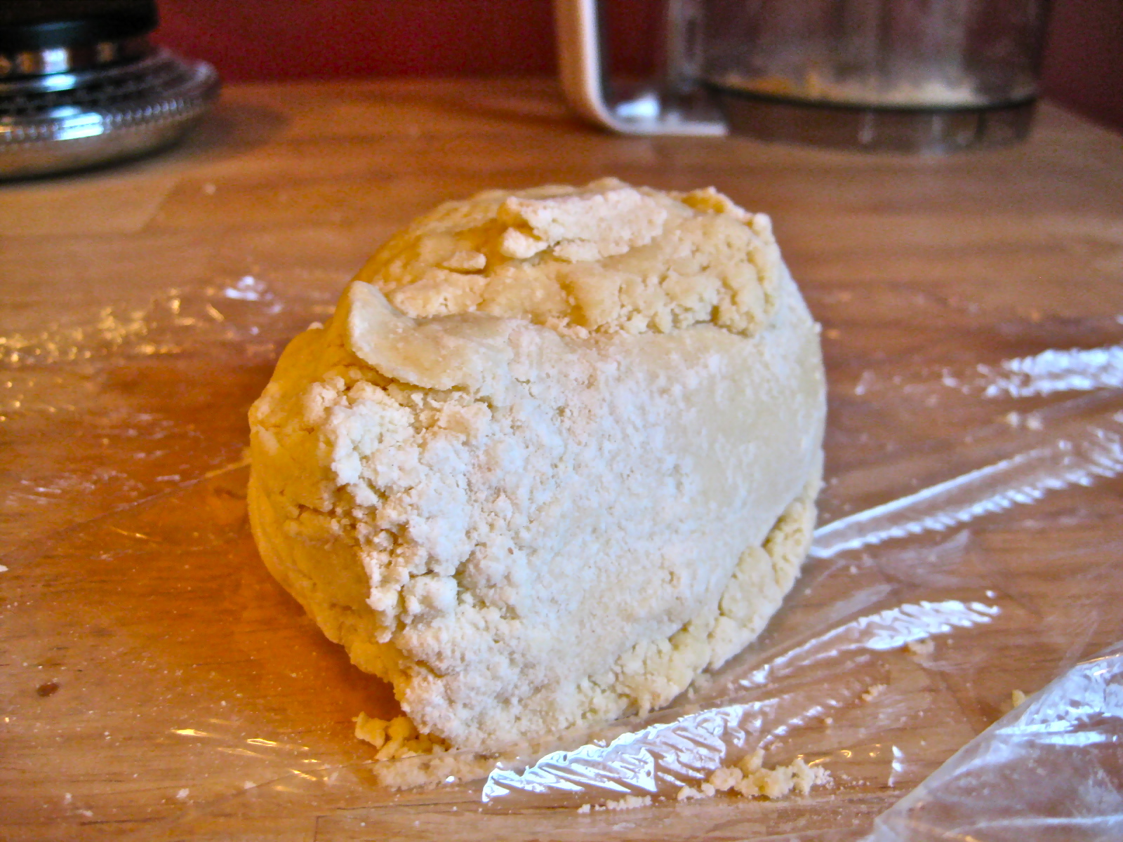 Drizzle the salt and water mixture over the dough and, if using a food processor, pulse until the dough comes together into a ball but is not completely smooth. You should still see visible butter chunks. If mixing the dough by hand, drizzle the salt and water mixture over the dough while tossing with a fork. The dough should come together in a shaggy mass. Gently mix the dough together until it comes together in a ball but is not completely smooth. As with the food processor dough, you should still see visible butter chunks.