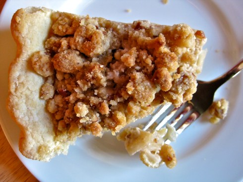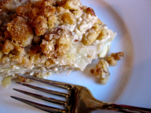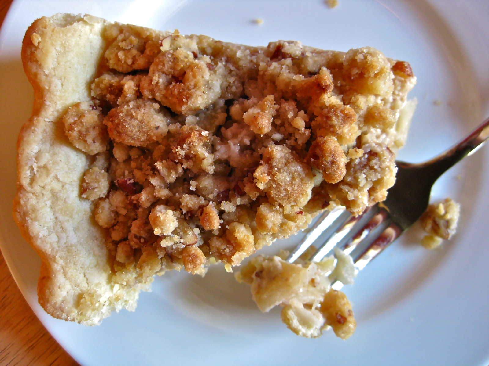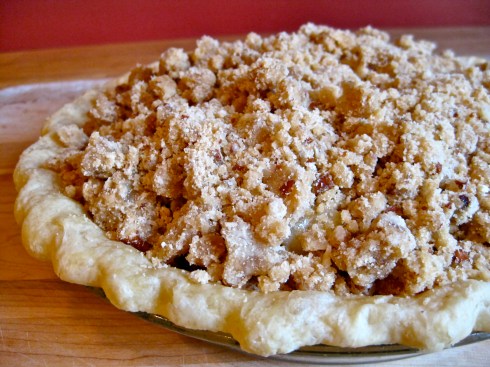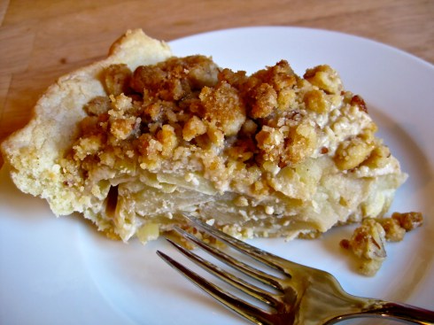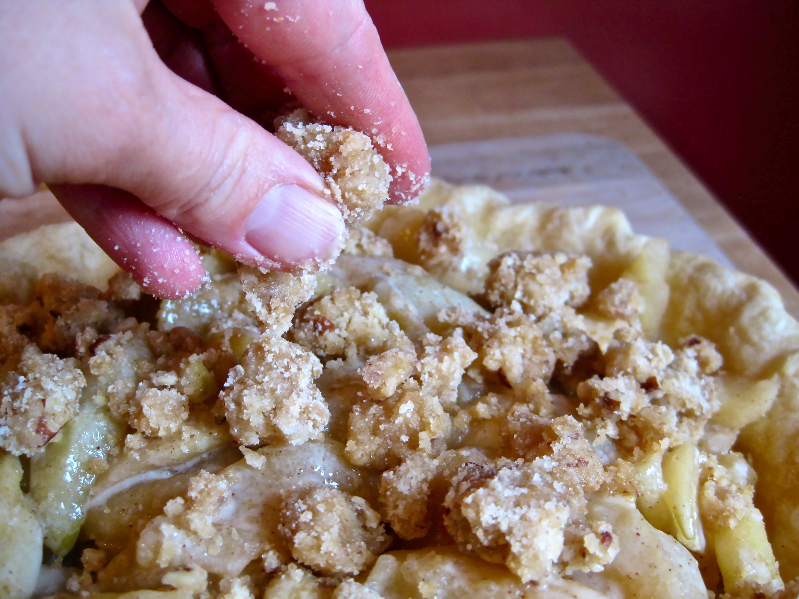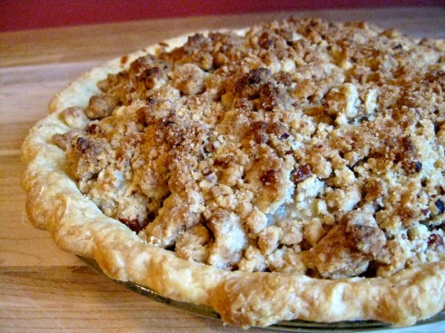 Which brings me, finally, to the rest of the recipe. A hybrid of a Cook’s Illustrated recipe and what I remember about the Dutch apple pie at the restaurant where I worked as a teenager (which called the pie a French apple pie, as there seems to be quite a bit of overlap concerning what people consider a French apple pie and a Dutch apple pie), the pie I ended up making is stuffed with sautéed tart apples and topped with a hearty, crumbly, pecan-crunchy lid. When baked, the crisp topping settles into the nooks and crannies left open by the baking apples, leaving no space unoccupied by tasty, cinnamon-laden glory. At the risk of making two loud proclamations in one post, dare I say that this apple pie is the best apple pie I’ve ever had? For now, yes. But only time will tell if its throne will one day be conquered. Tartine, it’s your move.