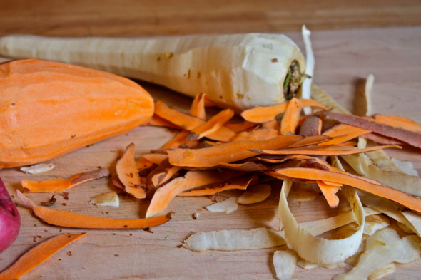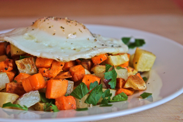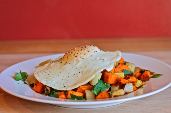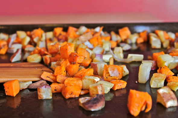 While the onion is cooking, peel the skin off of the boiled potato, and add it, along with the slightly cooled cauliflower, to a large bowl. Mash the cauliflower and potato together using a potato masher or, if you have strong forearms, a fork.